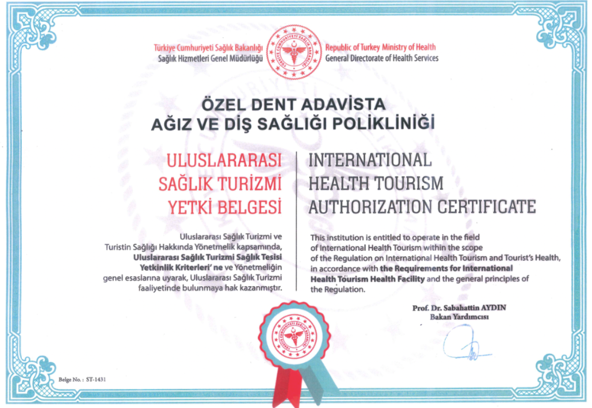 As Dent Adavista Clinic, we have a health tourism authorization certificate.